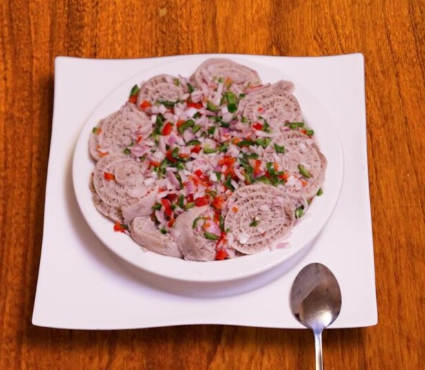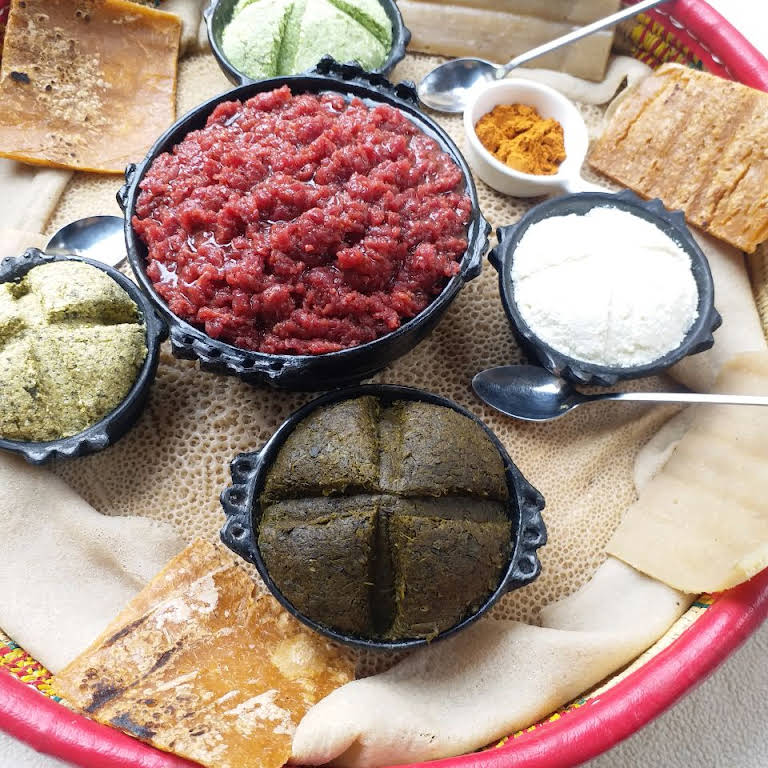 Finely chopped meat seasoned with butter, chili pepper, Kororima (Ethiopian cardamom) and served with Cheese, Black Cabbage , Injera & Kocho.
