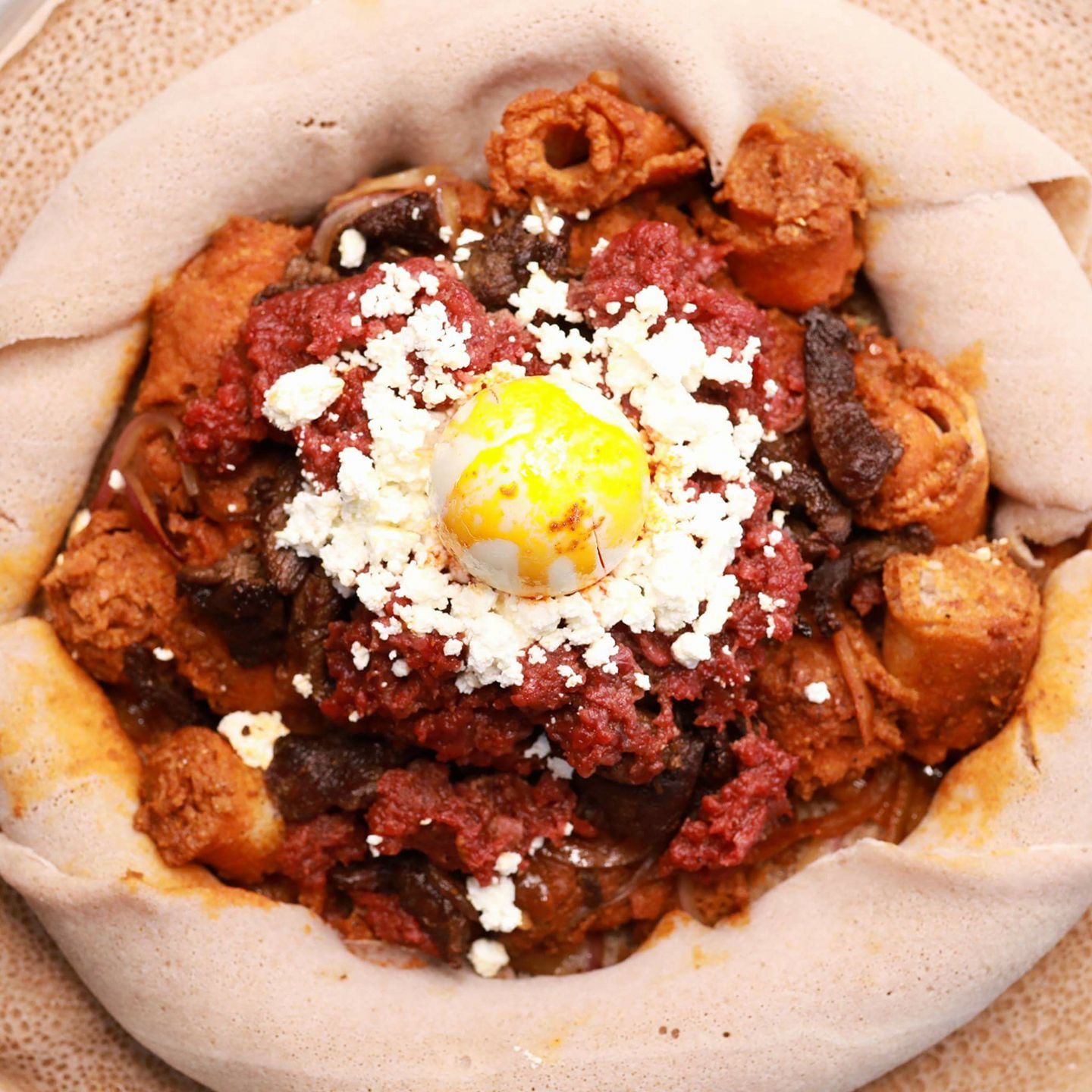 Shredded injera mixed with spicy beef stew, cooked with onions, peppers, and berbere spice blend.