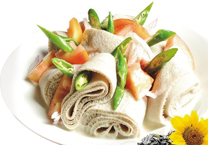A vegetarian version of Siga fifir; a spicy Berbere sauce mixed with onions, tomato garlic, and pieces of injera, served with Injera.
